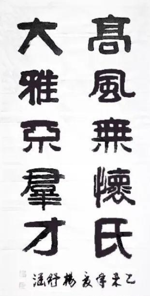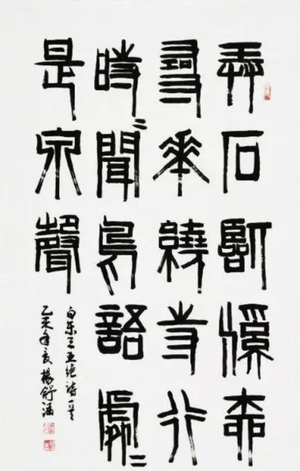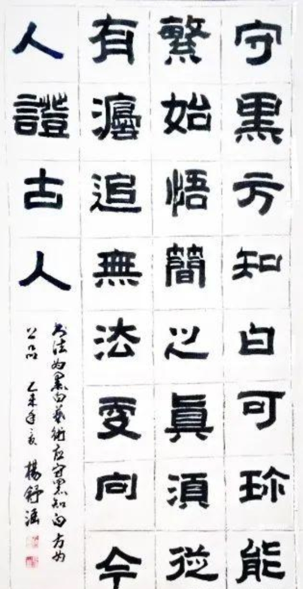 在书法方面,杨舒涵在书法创作中继承了父亲在隶书创作中的独特见解和技法,注重线条的质量和韵味,体现出隶书的古朴之美;此外,其绘画中的灵动性和自然气息也渗透到书法创作中,使书法作品在古朴的基础上增添一份灵动之美,在笔画的起笔、收笔和转折处,运用一些自然流畅的笔法,避免过于刻板和生硬。并且,在她的部分书法作品中还能领略到篆书的韵味,线条圆润流畅、婉转自如,结构对称规整、严谨有序。在杨舒涵的书法作品中,我们可以看到她笔下的力量和结构的严谨性,这些特质在传统书法艺术中备受推崇。她的笔触强劲而有力,每一笔都透露出坚定和自信,这种力量感不仅源自于她对书法线条和结构的精湛掌握,更是她个性中坚定和果断的直接体现。在一些作品中,她的笔法如同疾风劲草,展现出一种不屈不挠的精神;而在另一些作品中,她的书法则又显得更为内敛和高雅,透露出一种超然物外的大气和深邃。这些作品的结构严谨而不失灵动,每一笔每一划都恰到好处,既遵循了传统书法的规则,又不乏个人的创新和表达。这种结构的严谨性,反映了她对书法艺术深刻的理解和尊重,同时也展现了她对细节的极致追求和对完美的不懈探索。