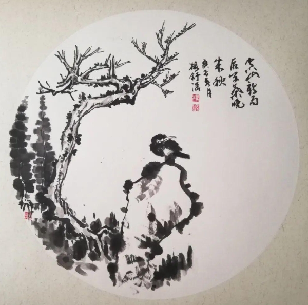 除了对笔墨的运用,杨舒涵在构图上也展现出了极高的艺术造诣与独特的个人风格。无论是圆形构图还是长方形构图,她皆能巧妙布局画面元素,精准掌控平衡与和谐,于圆形中让花朵与枝叶均匀分布以稳持重心,在长方形里借助元素的大小、疏密与位置构建平稳秩序。同时,其虚实相生的构图手法更是精妙绝伦,如芭蕉图,实写芭蕉叶而虚绘背景,在鲜明的对比下,不仅使鸟的主体形象跃然纸上,格外突出,更营造出空灵悠远的意境,让整个画面宛如诗意的梦幻之境,满溢着艺术的灵韵与深邃的审美意趣,彰显出她对构图艺术深刻的理解与卓越的驾驭能力。